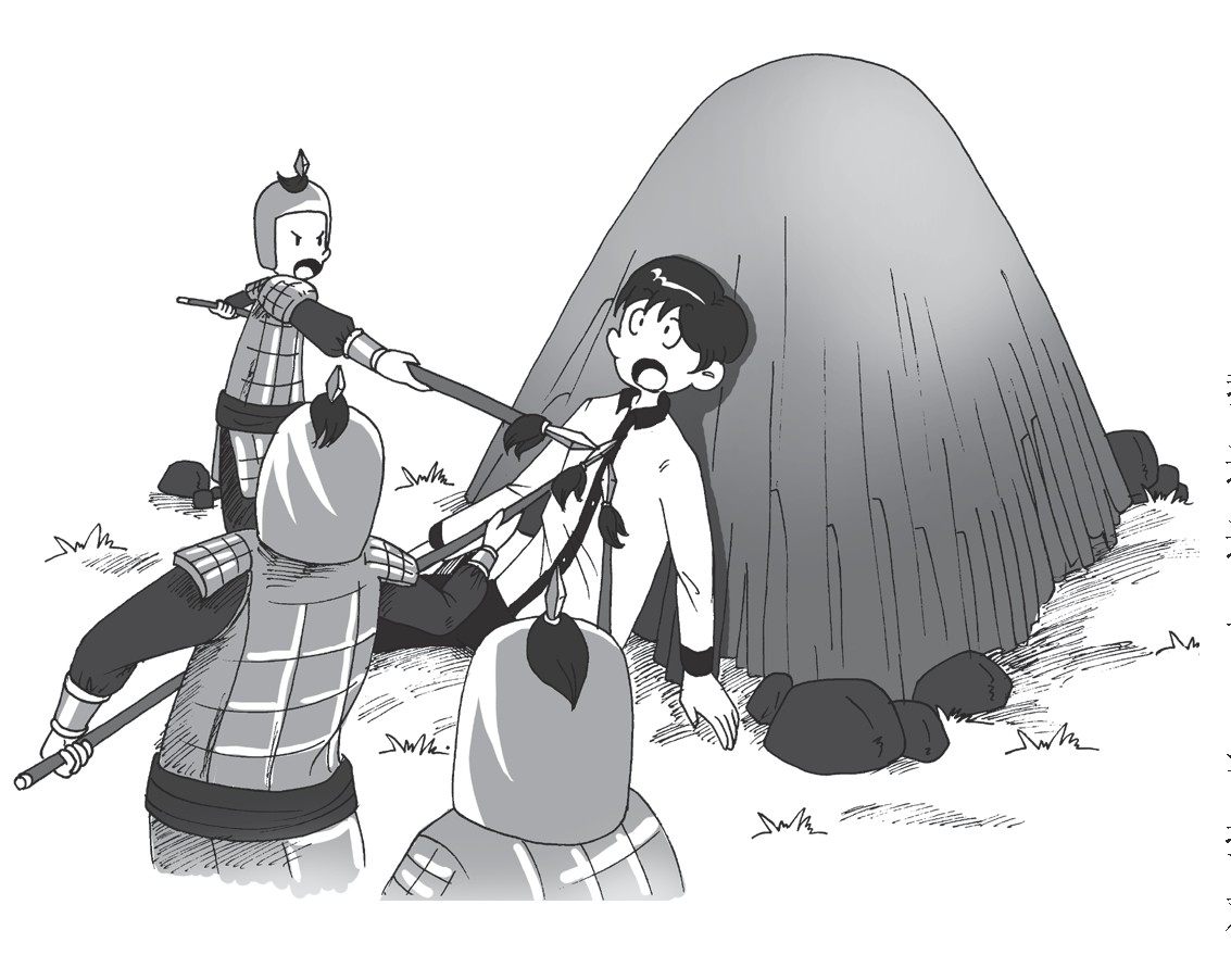 晚上才看完《卧薪尝胆》的故事,谁知第二天醒来,却发现自己已经躺在干草堆上。我起床四处打量,却被一群闯进来的士兵捆绑起来。他们穿着盔甲,拿着铜剑把我押送到一个穿着古装的中年人面前。那人非常严肃,拿剑指着我问:“你究竟是谁?为什么会突然出现在我的房间?”