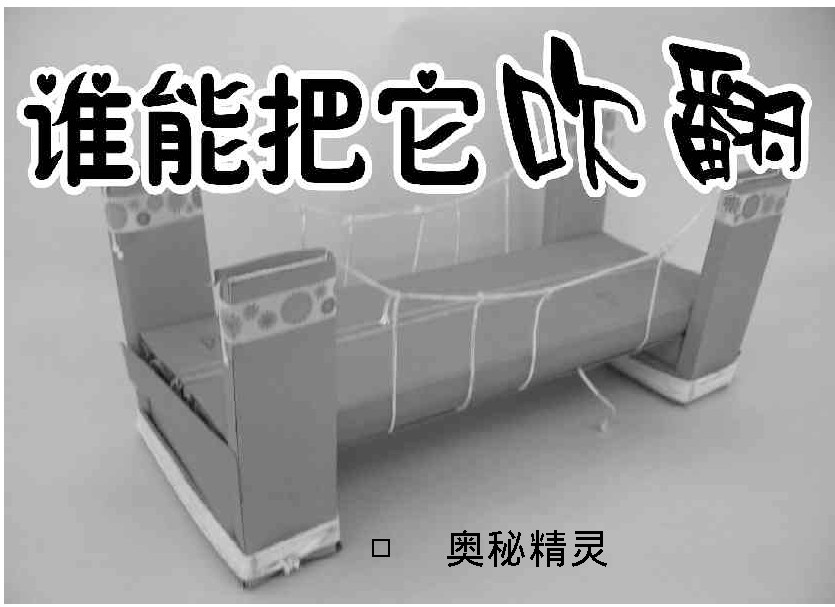 取一张长15厘米、宽5厘米的薄纸卡或硬纸片。把它的两头折一下,使这张纸卡或硬纸片成为一座小桥。把这座“小桥”放在桌上,然后,你可以让你的朋友们按照要求来试一试,看谁能把这座小桥吹翻。这个要求就是:人趴在桌面上,嘴对着桥洞使劲地吹气。