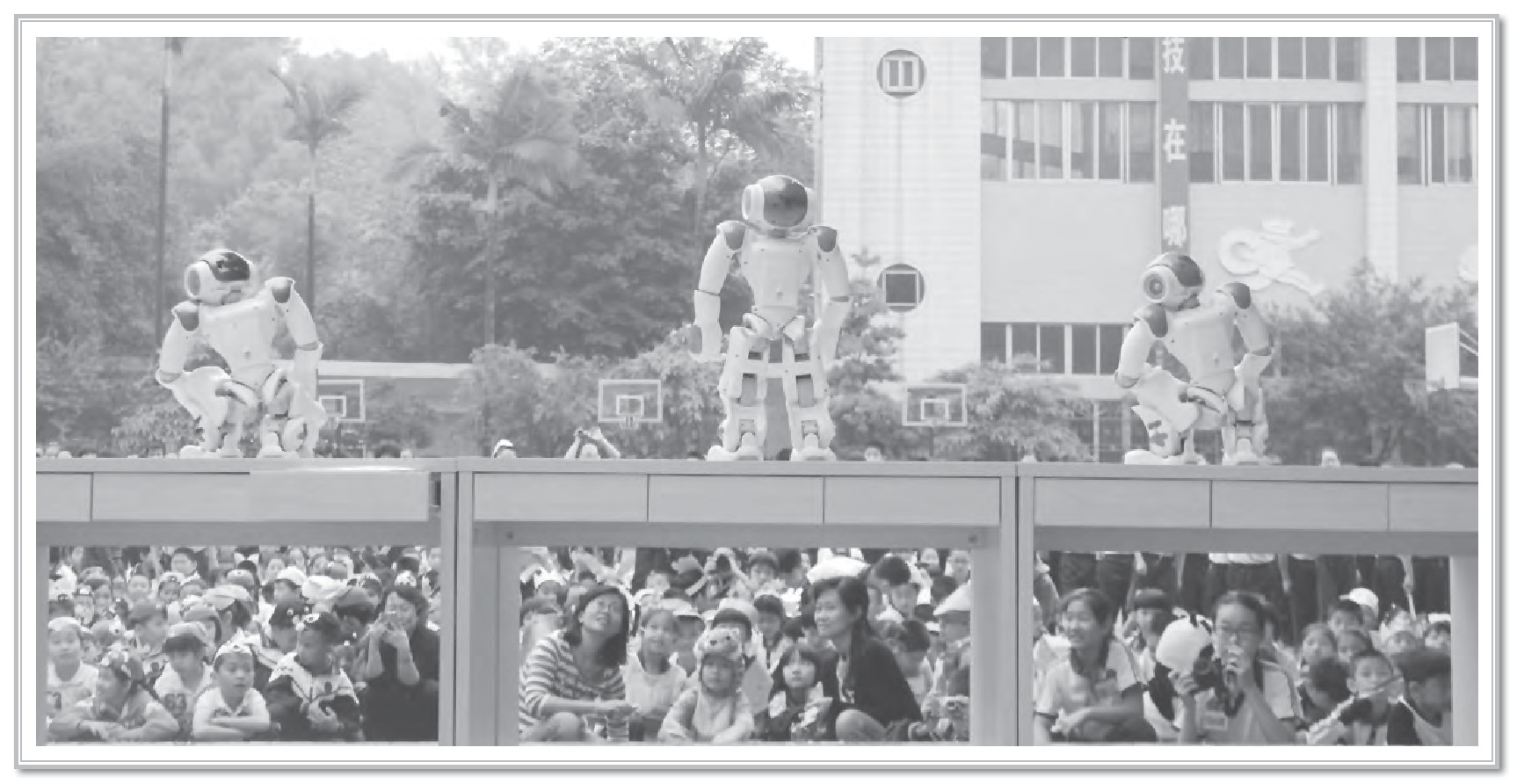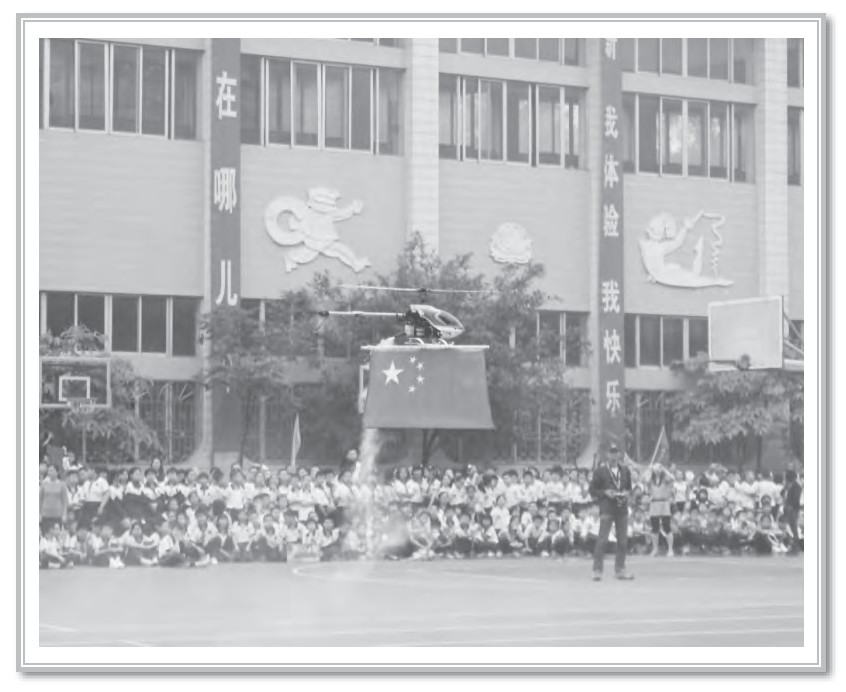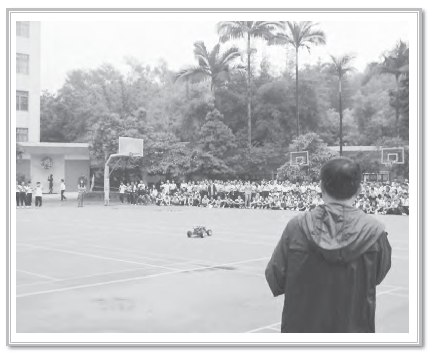 入场仪式过后,机器人在展示台上自如地摆出各种造型,模型飞机挂着五星红旗在低空不断盘旋,模型汽车在篮球场上飞速地来回奔跑。同学们的眼睛里全都散发出异样的神采,那是对科技充满好奇的目光,而此起彼伏的惊叹声也饱含着他们对科技的憧憬。