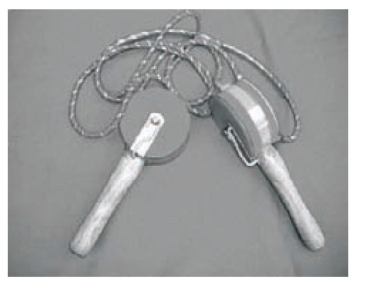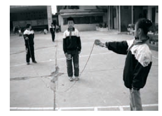 于是我和爷爷一起商量讨论,如何使绳子能够变长变短,提出了许多的设想。在河边钓鱼的人,他们的钓竿都有一个绕线的轮子,钓鱼线在轮里可长可短。根据这个原理,我们把家里的塑料块做成圆形,用一根螺丝杆把圆塑料块夹起来,这就是绕绳子的轮子,再把塑料管切成33毫米高的圆柱体,粘合上去。用木棍做了两个手柄,把绕绳轮子安装好,轮子的螺杆轴一端稍大一点,钻一个孔,在孔内采用一根钢丝,弯成一个绕绳子的绞手柄,绞手柄一转动,绳子就可以伸长缩短了,然后把绞手柄反扣在手柄上,就可以使绳子固定住了。这个像拨浪鼓一样的跳绳工具在我和爷爷的努力下终于诞生了。