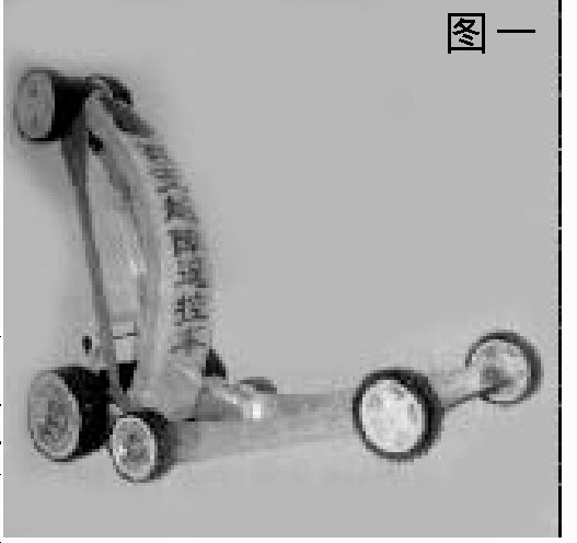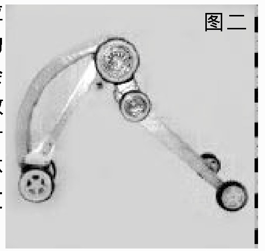 百变越障遥控车安装有4个动力,两个后主动力可实现快速的前进和后退,而且能实现灵活转向。第三个动力在后轮上,它就是长臂。它的作用可大了,可以支起车身进行直立翻转,能有效越过一般障碍。此外还可以把车身竖起来,做一个漂亮的直立大旋转(如图二)。长臂可以做360度旋转,使用时放在不同位置,车的重心就会随之改变,此时车将以不同轮为支点旋转以调整车位。在做大跨度的跨越时,前轮就发挥作用了,这就是第四个动力。我们设计的前轮速度较低,通过前轮的前后转动来调整车的位置也十分方便。