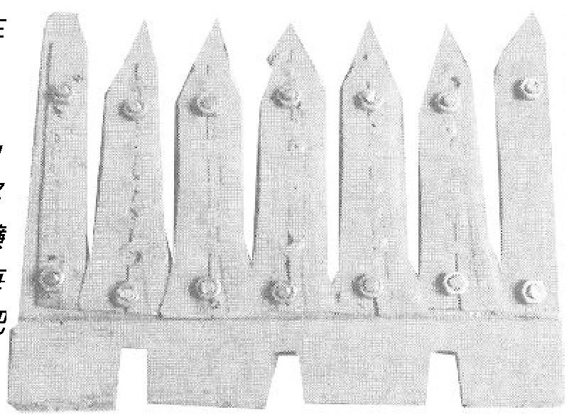 用厚3 m m,长、宽都是1 6 c m的铁皮,割成宽lcm的6条小槽。购买1 2把薄型全钢无柄镰刀,将两把镰刀点焊成“人”字形固定在槽中,每条槽中便有左右两把锐利刀片,把摘花生果器固定在板凳一端上。