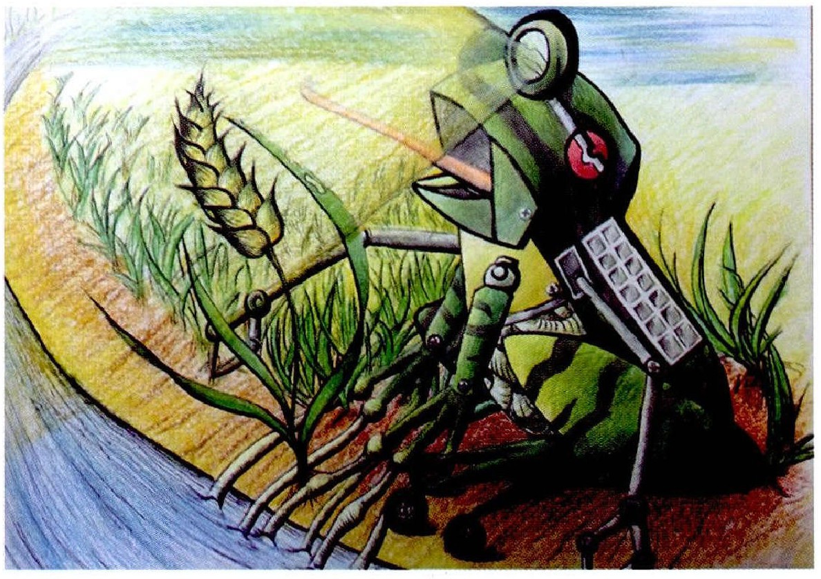 近年来空气污染严重,庄稼的生长受到了严重影响。我想设计一款机械青蛙,它具有多种功能,自带滑轮装置,还安装了接收和转化太阳能的装置。夜间它的眼睛可发光,能辨别害虫。它还装有吸水和排水软管,可以根据不同情况,对田地进行灌溉。