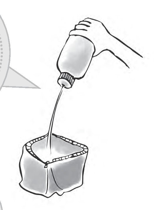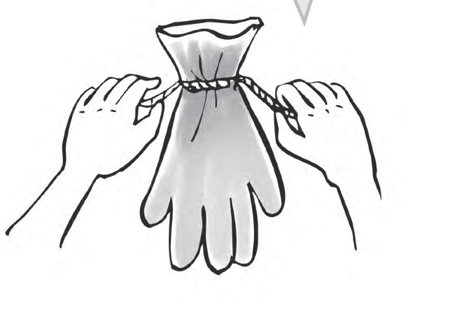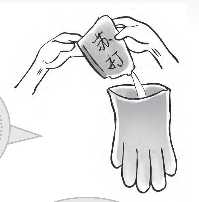 “是啊,这个五指炸药很好玩。”王老师微笑着说,并开始着手制作起五指炸弹来,“我们先往塑料手套中装一些小苏打粉。再往小拉链袋中倒一些食醋,把小拉链袋的口封住,但是不要封全,大约留一条2毫米的缝隙。然后把装有食醋的小拉链袋放入塑料手套中。最后将手套的开口处用橡皮筋扎紧。”王老师一边现场制作着五指炸弹,一边将步骤讲解给同学们听,“就这样,一个完好的炸药包的制造就大功告成了!现在我们得迅速将小拉链袋中的醋挤出,并快速将手套扔在地上。”