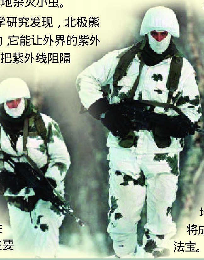 防寒军服科学研究发现,北极熊的毛呈中空的管状结构,它能让外界的紫外线透进来,又能巧妙地把紫外线阻隔在“管子”里,所以,北极熊的毛不仅保暖性能好,还有自动增温的作用。美国研究人员想利用这一原理来制作防寒军服。他们研制出一种人造纤维。这种纤维也是中空的,重量轻,弹性高,保温性能好,是防寒军服的主要材料。