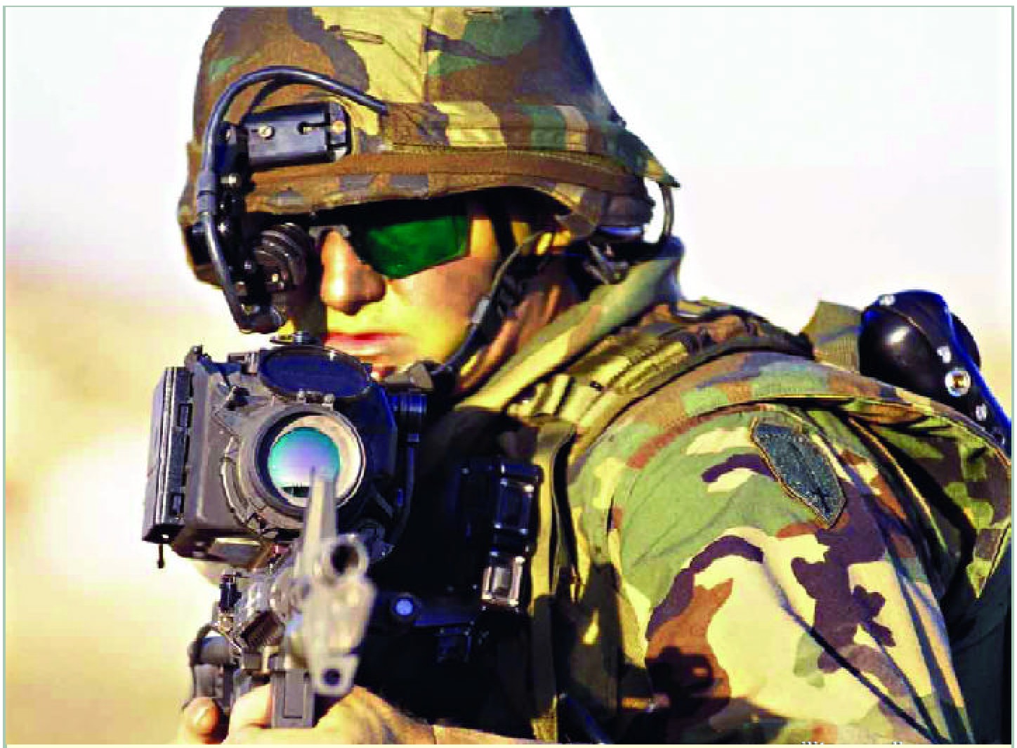 它是一套轻型战斗被服,内嵌个人局域网,能够下载战场态势感知数据。天线埋设在被服内,可以减弱信号特征,保证士兵不被敌方探测到。这种军服不仅可以防弹,还具备生化防护能力。头盔上的告警系统,能让士兵免受激光或地雷威胁。