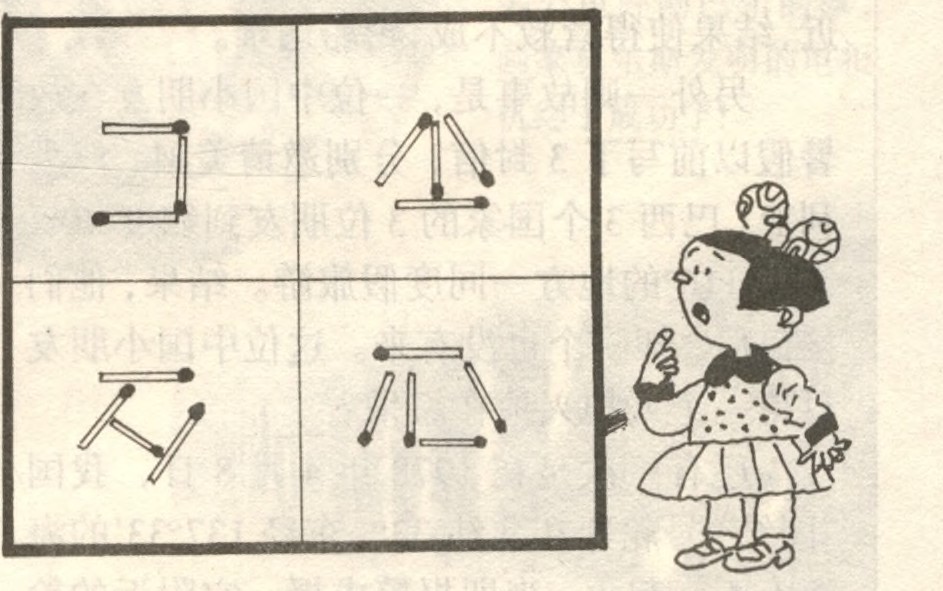 请在下面四个方格中,各移动其中一根火柴的位置,组成四个汉字,且这四个字能组成一句成语,请赶快动手又动脑吧!