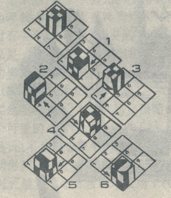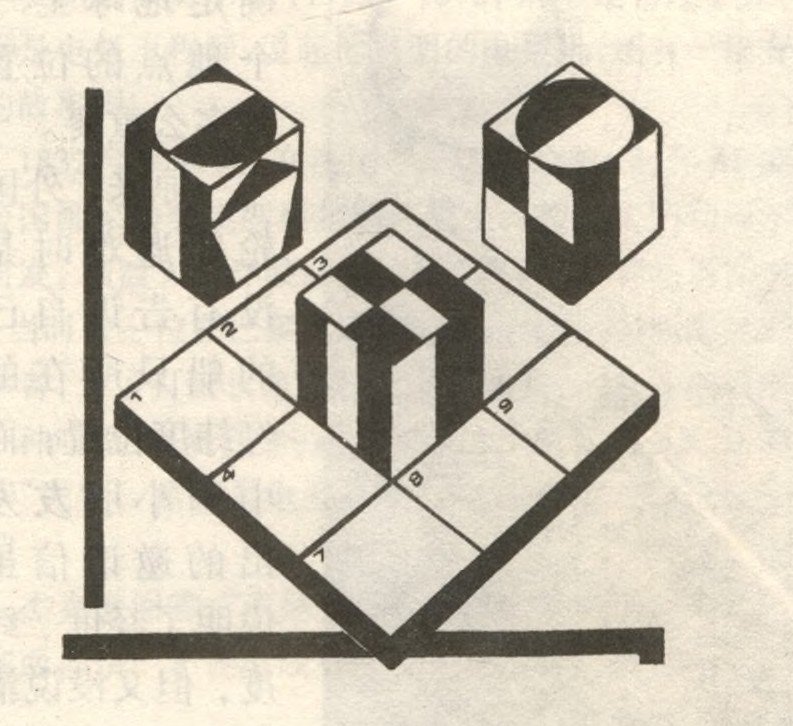 请先推测出图中3块立方体的每一面应是什么图案?然后将中间板上的立方体翻滚6次,使其到达编号7的方格内,但必须是能见到的3个面是板外右上角图形,该如何翻滚?
