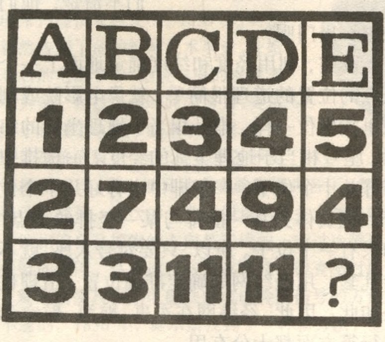 请根据A、B、C、D四列竖行数字的排列规律,推算出E列竖行“?”处应填上什么数?