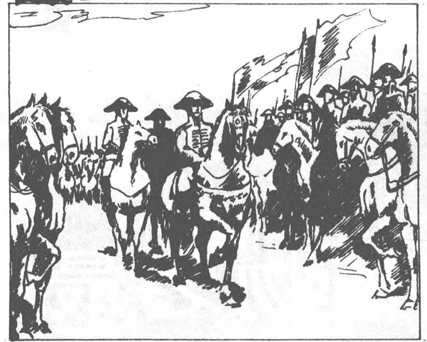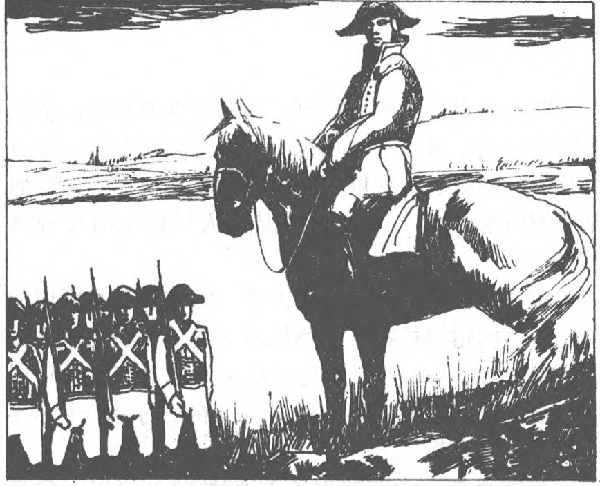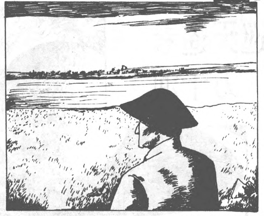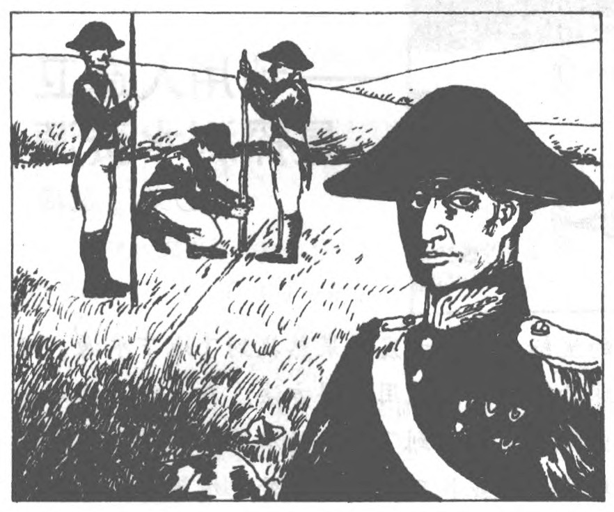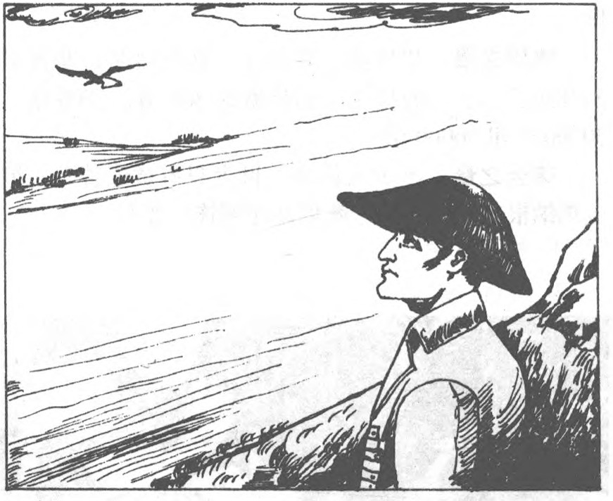⑥一个测量河宽的妙法顿时浮上拿破仑心头。他先从岸边一步步地向后退去,一直退到莱茵河南岸的边线也正好擦着他的帽舌边时,便停下身来。