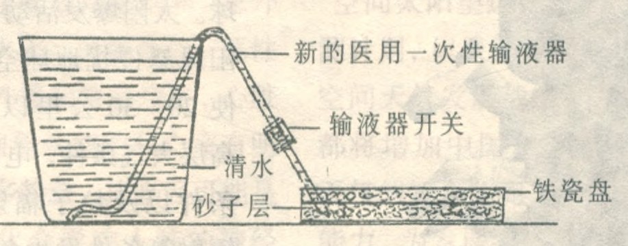 针对这些问题,我又开始了第三期试验。改木盘为铁瓷盘,先垫上一层厚厚的小石子,铺上一层消毒过的旧棉絮,再盖一层软棉布。将水注满石子层,铺上泡好的花生仁,上面加盖几层吸水性强的纱布。夜间采用如下图的滴灌装置: