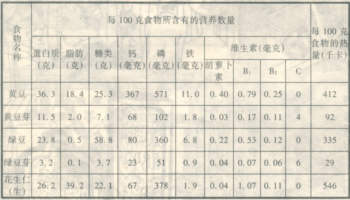 在老师的帮助下,我找到了一份“主要植物性食物的成分表”,其中黄豆、绿豆、黄豆芽、绿豆芽、花生仁的营养成分如下表。