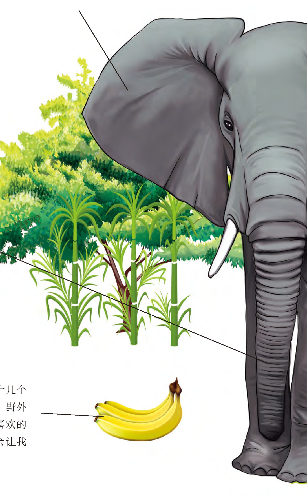 我的食量很大,一天要花十几个小时来采集并吃下50千克食物。野外的树叶、树皮、嫩芽等都是我喜欢的食物,农田里的香蕉和甘蔗也会让我忍不住跑去偷吃一点。
