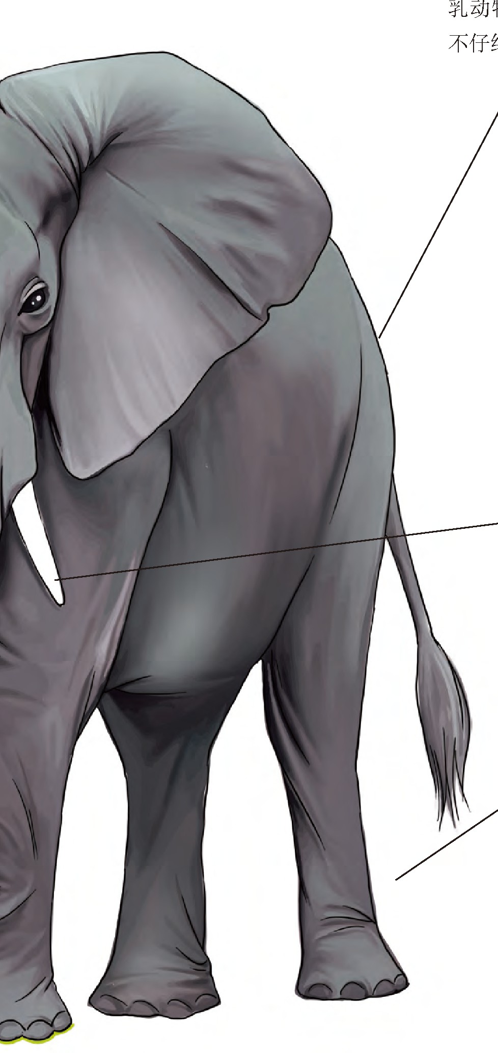 我的四肢非常粗壮,而且全都几乎垂直于地面,像四根柱子。它还有一个特殊的功能,当我的脚踩踏地面后,会发出超声波,远处的同伴用脚就能感觉到我的存在了。再告诉你们一个小秘密,我的前后肢的脚趾数量不一样呢,前肢有5个脚趾,后肢却只有4个。