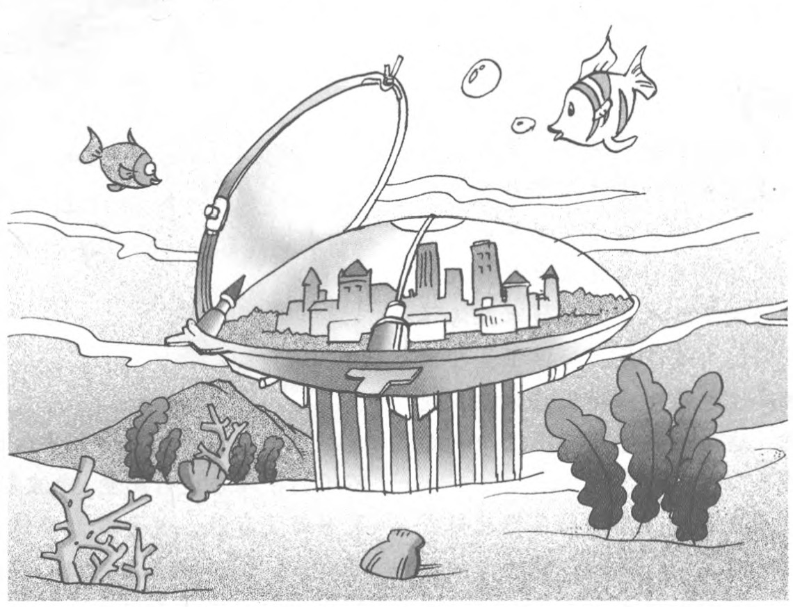 “呀,灯火通明的'钢屋子'!这里可以看见外面的海洋生物,真像一座水族馆一样!”小灵通,这可是个海底城市哦!它建在200米深的海底,整个城市由1万多根非常坚固的柱子支撑着。柱子附近设有感应装置,可以测台风、海啸和暗流,并且可以保持海洋城市的平稳。除了住宅区外,城里还有商业中心,网球场,栽种水果蔬菜的人工田和交错的道路……哇噻,真是太神奇了!