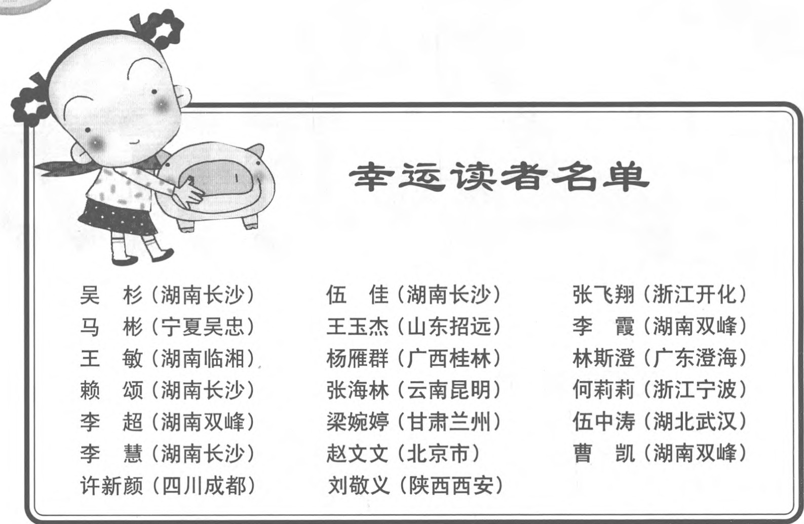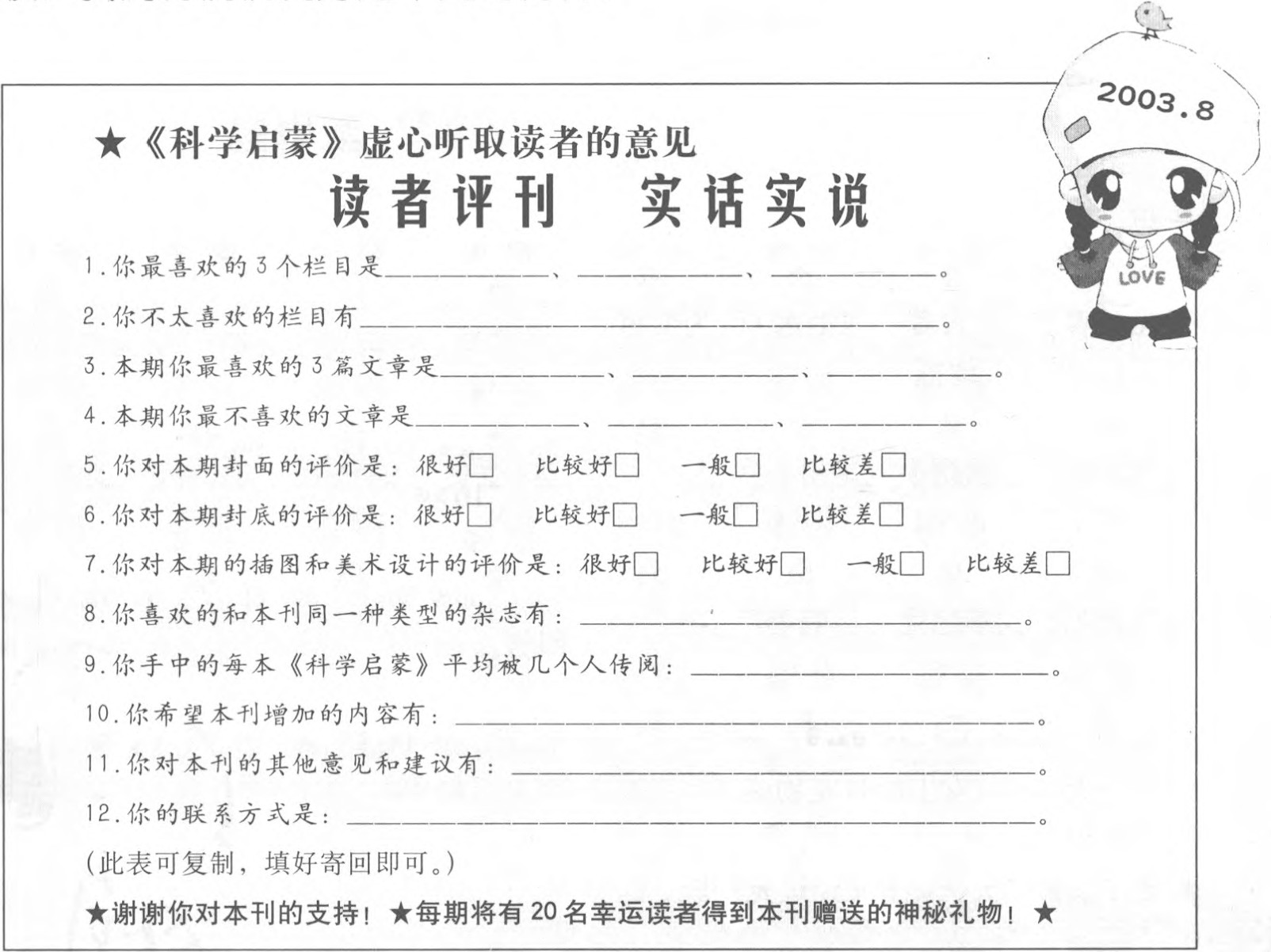 以上20名幸运读者将得到本刊赠送的神秘礼物。希望每一位喜爱《科学启蒙》的热心读者都能像他们一样,拿起你手中的笔,认真填写每一份读者评刊表,并尽快寄给我们。我们每期将抽出20名幸运读者,将名单公布在杂志上,同时赠送神秘礼物一份。来信请注明学校和年级,我们将视情况分赠不同的礼物。