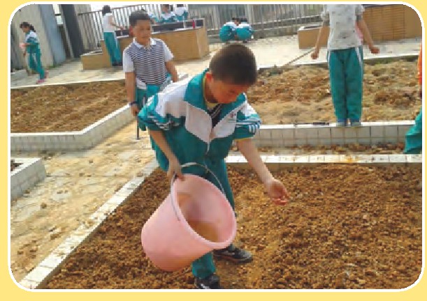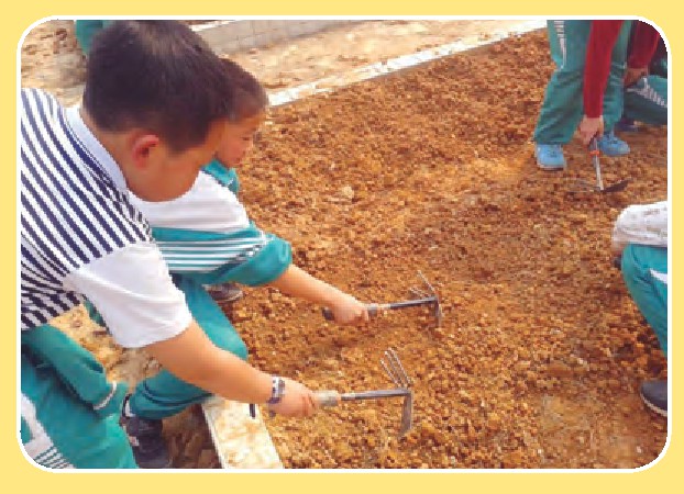 学校正在逐步地将生态两型的种子植入孩子们的心中,进而希望推进整个社会对生态环境的关注,实现人与自然的和谐共处。瞧,孩子们在老师的带领下,来到学校生态教育实践基地——开心农场,开荒种地、松土施肥。伴随着孩子们的好奇与希望,一颗颗种子破土而出,成为校园里一道独特的风景。