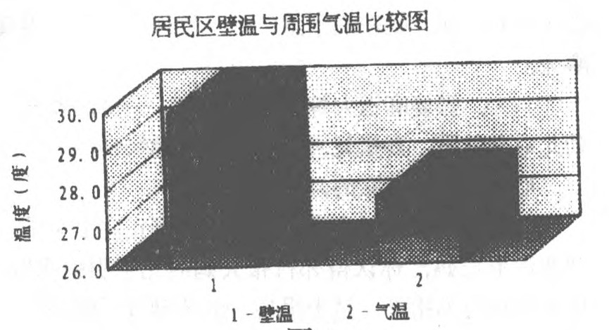 让我们来具体看一看城市居民区的温度。从建筑物的墙壁来看,它的温度确实很高,达到当日测量的最高点(见图3),并且在正午时墙壁和气温差别最大。(由图4居民区壁温与气温比较可见,它们的平均温度相差也是很大的。)这是因为此时太阳辐射最强烈,由于热力学性质的不同,墙壁温度升高相对它周围的空气显著,蓄积了大量的热量,这是造成“热岛”现象的直接原因。城市建筑接受热量的方式为:先大量吸收,接着迅速增温,然后向四周传热。