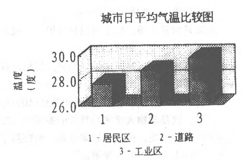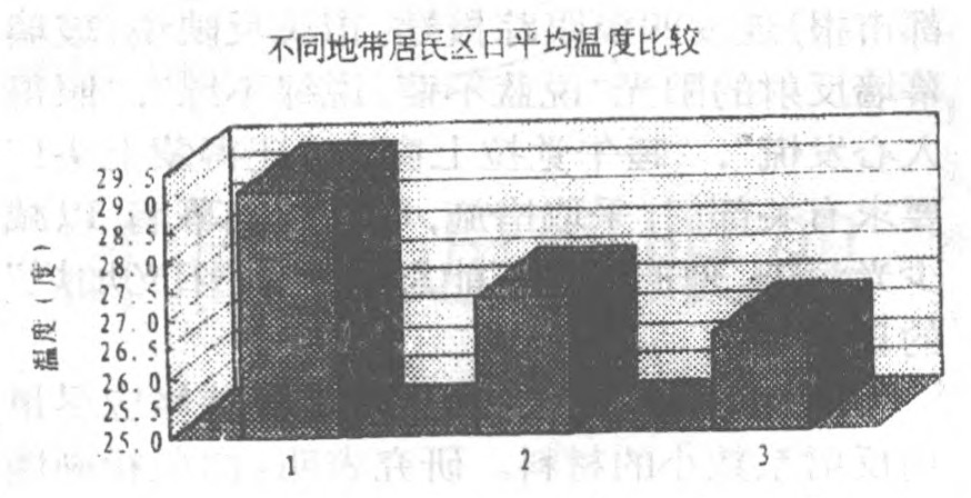 对我们测得的自然环境的数据,可明显的发现它的平均温度较低,温差较小,这其中高大乔木区表现最明显,温差只有7.2℃ (城市平均值为10.5℃),且正午的气温比其它地方都低,草地高度小,叶片小,数量少,效果自然差些。水的体积大,热容大,温度变化比较难,因而也能起到调温作用。这就告诉我们,绿色植物和水域确有调温的能力,这种能力虽然产生机理不同,但是都表现为它们使温度变化缓慢,且变化幅度小。绿色植物接受热量后,并不辐射,而是转化为提供其自身生活的化学能、生物能。这种能量的转化不仅对于热量减少有益,而且它生成的新能量和物质又是大自然生态平衡的重要组成部分。这就启示我们可以利用绿色植物和水域来调节城市气温,削弱或消除那些钢石结构及人群生产生活对温度的影响。