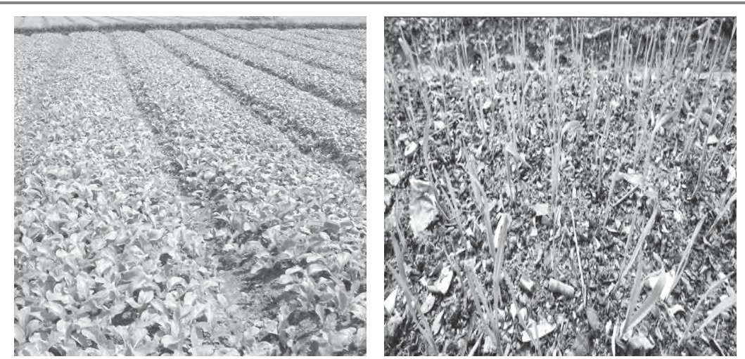 正常土壤下菜心的生长情况与垃圾实验田里的蕹菜生长情况对比图