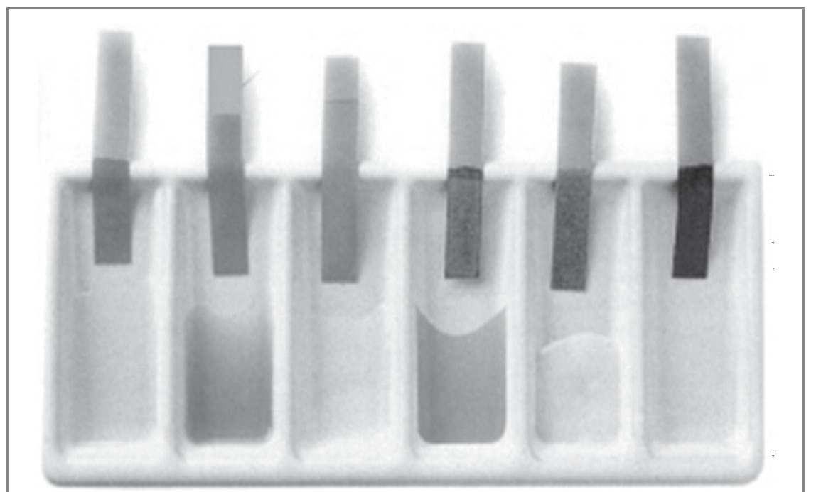 “垃圾菜”和无公害蔬菜的pH从酸到碱呈现不同颜色(左边三个为“垃圾菜”,右边三个为无公害蔬菜)