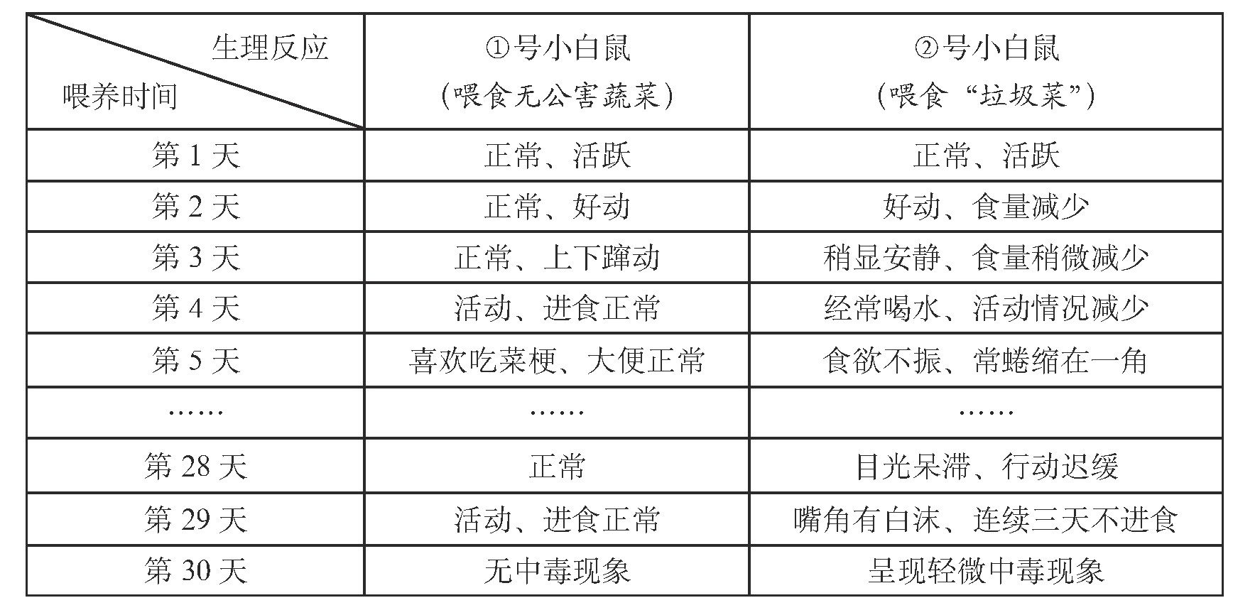 我们用“垃圾菜”和无公害蔬菜分别喂养小白鼠,喂养周期为30天,观察它们在不同喂养环境下的生理反应,从而推测“垃圾菜”对人体健康的影响。