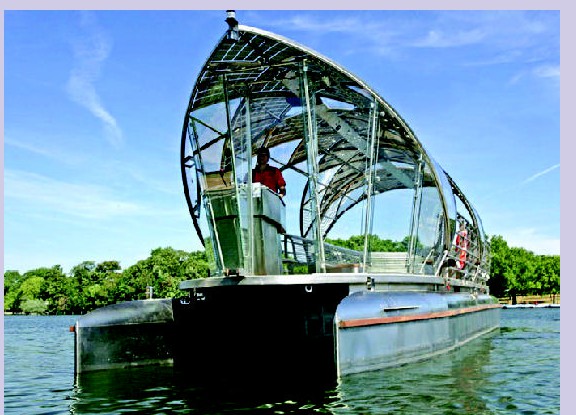 这艘船长约14.5米,船上搭建了许多不锈钢架,架子上安装了27块太阳能板,相当于安装了一个太阳能顶棚。这些太阳能板对阳光强度的要求不高,即使在阴天,它们收集到的光能也足够驱动这艘船。更重要的是,这艘船是双重环保。由于安装了两个静音引擎,这艘船在航行时没有噪声。