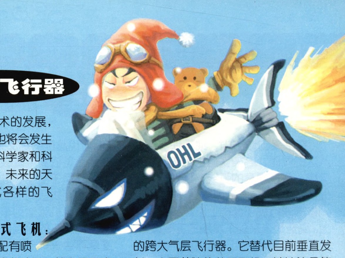 宇宙喷气式飞机宇宙喷气式飞机配有喷气式发动机和火箭发动机,前者用于空中飞行,后者用于宇宙飞行。当这种飞机从地上起飞时,先发动喷气式发动机,当它飞到30千米高空时,再点燃火箭发动机,飞向宇宙空间。这样的喷气式飞机可将90吨的物体或数百名乘客送往宇宙空间站或其他星球。到那时,乘坐飞机去外星旅游将不再是梦中才能做到的事了。