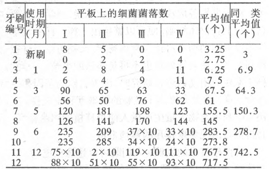 1.牙刷上的细菌数随使用期的增长逐渐增加。因此,提倡勤换牙刷(一般以3个月为宜),或对旧牙刷定期消毒处理。