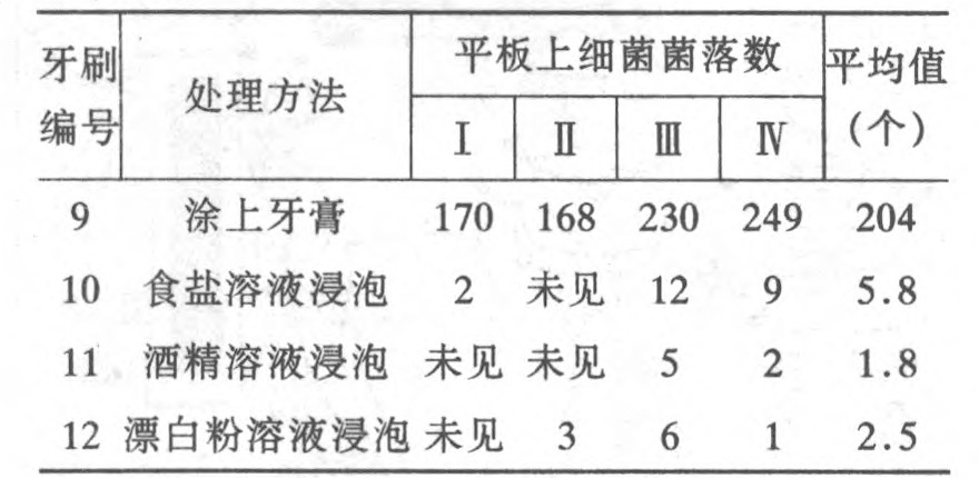 实验说明:牙刷涂上牙膏后,细菌数量有所减少,但不能完全灭菌。使用食盐、酒精、漂白粉溶液,可以对牙刷达到消毒、杀菌作用,尤其可以大量杀死乳酸杆菌,因此是理想的消毒方法。特别是漂白粉,是农村中常见的消毒药品,更易于推广。