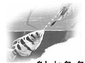 射水鱼色彩十分鲜艳,射水技巧相当厉害。别看它长着一对水泡眼,眼白上有一条条不断转动的竖纹,可在游动时,它不仅能看到水面的东西,也能察觉空中的物体。一旦有捕食对象,便偷偷游近目标,先行瞄准,然后从口中喷出一股水柱,将昆虫打落水中。它的嘴沿上生有一道很细的槽,用舌尖能形成“水枪管”,只要把吸进的水从“枪管”中逼射出来,就能化成一束湍急的高压水柱,能把水射到3米多高。