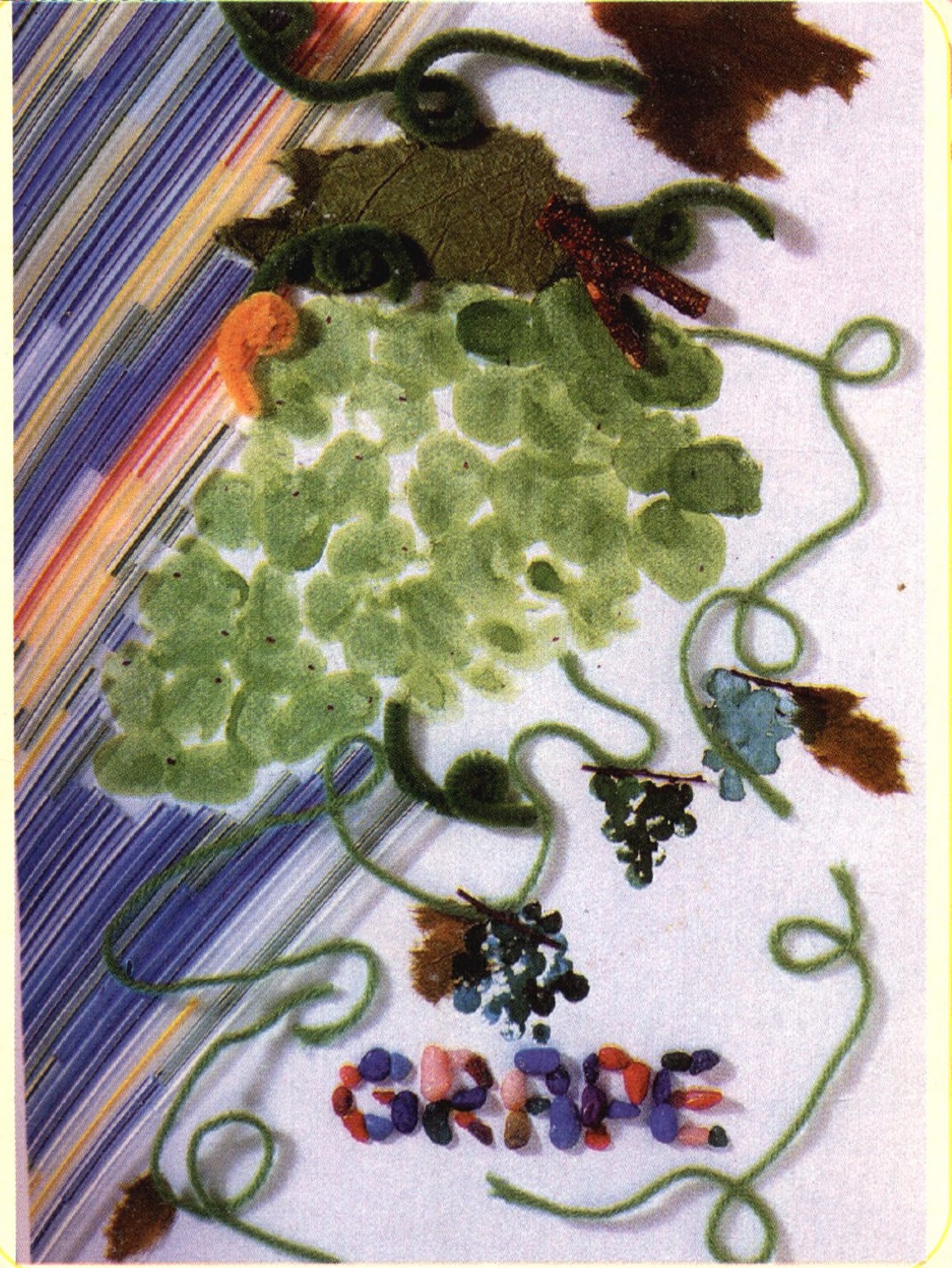 轻轻松松手压印,印出葡萄的效果,树枝让葡萄串看来更有真实感,吸管颜色变化也让背景活了起来。