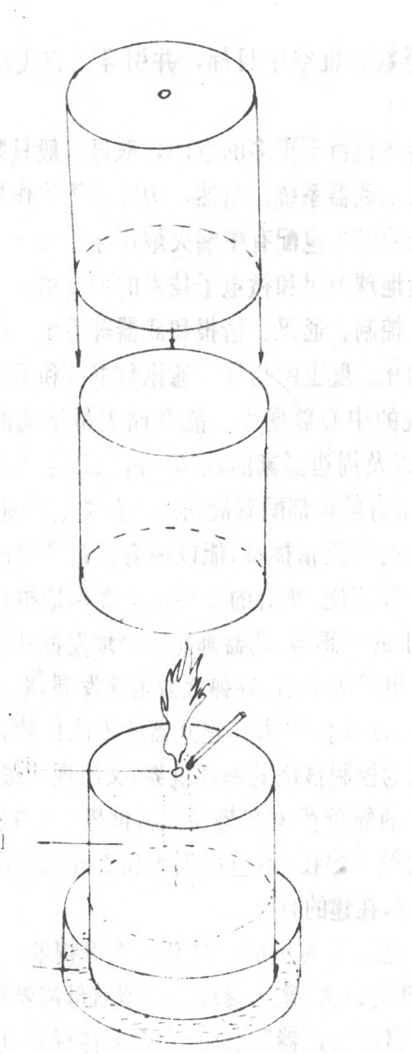 1.制作方法:将两个带底的易拉罐筒拼合成一个酒精筒(如右图上所示),并在其上盖表面钻一个小孔(即气孔),然后放进铁罐内便组成了一个简易的汽化酒精炉。