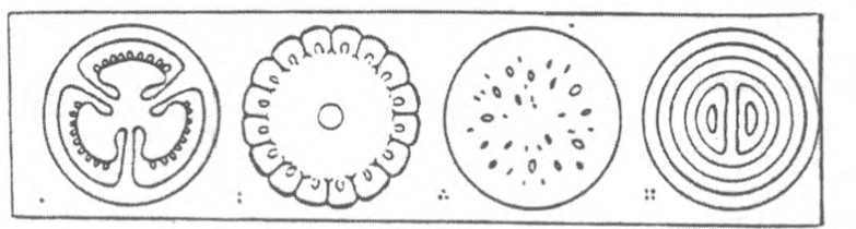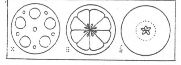 我们常吃的水果和蔬菜,它们的横截面常构成美丽的图案。你能猜出下面几个图案是什么东西吗?