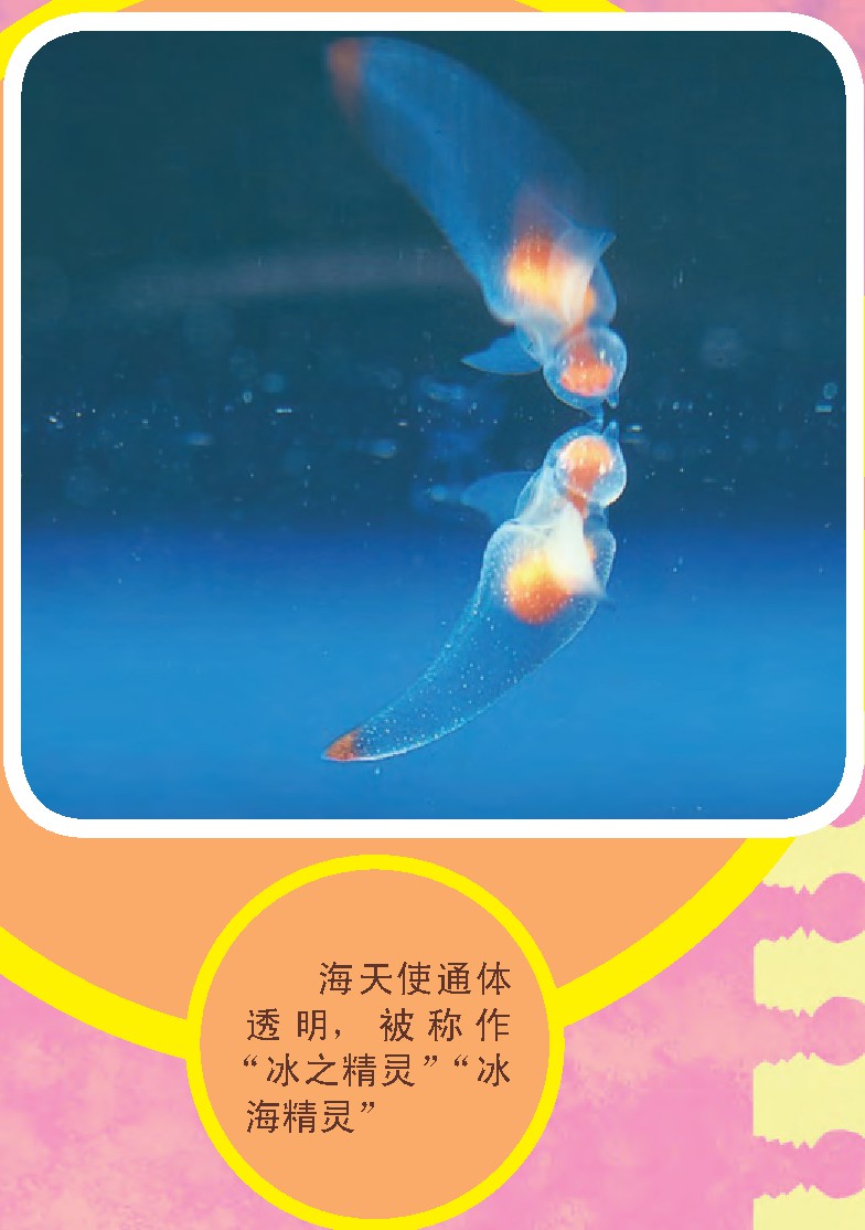 海天使又称裸海蝶,是生活在恩德伯里岛海域的软体动物。它们的游泳姿态既美丽又鬼魅。海天使是雌雄同体的动物,以软体动物海蝶为食。除了透明的“翅膀”之外,海天使还具有尖尖的、像角一样的突起。