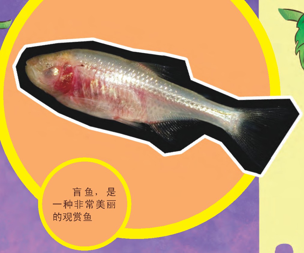盲鱼,体长大约为8厘米,身披亮银色鳞片。大约在数万年前,盲鱼的祖先被水流带到了只有很少光线或完全没有光线的地下洞穴内,随着漫长的岁月流逝,它的眼睛因无用武之地而退化,变成了今天的盲鱼。