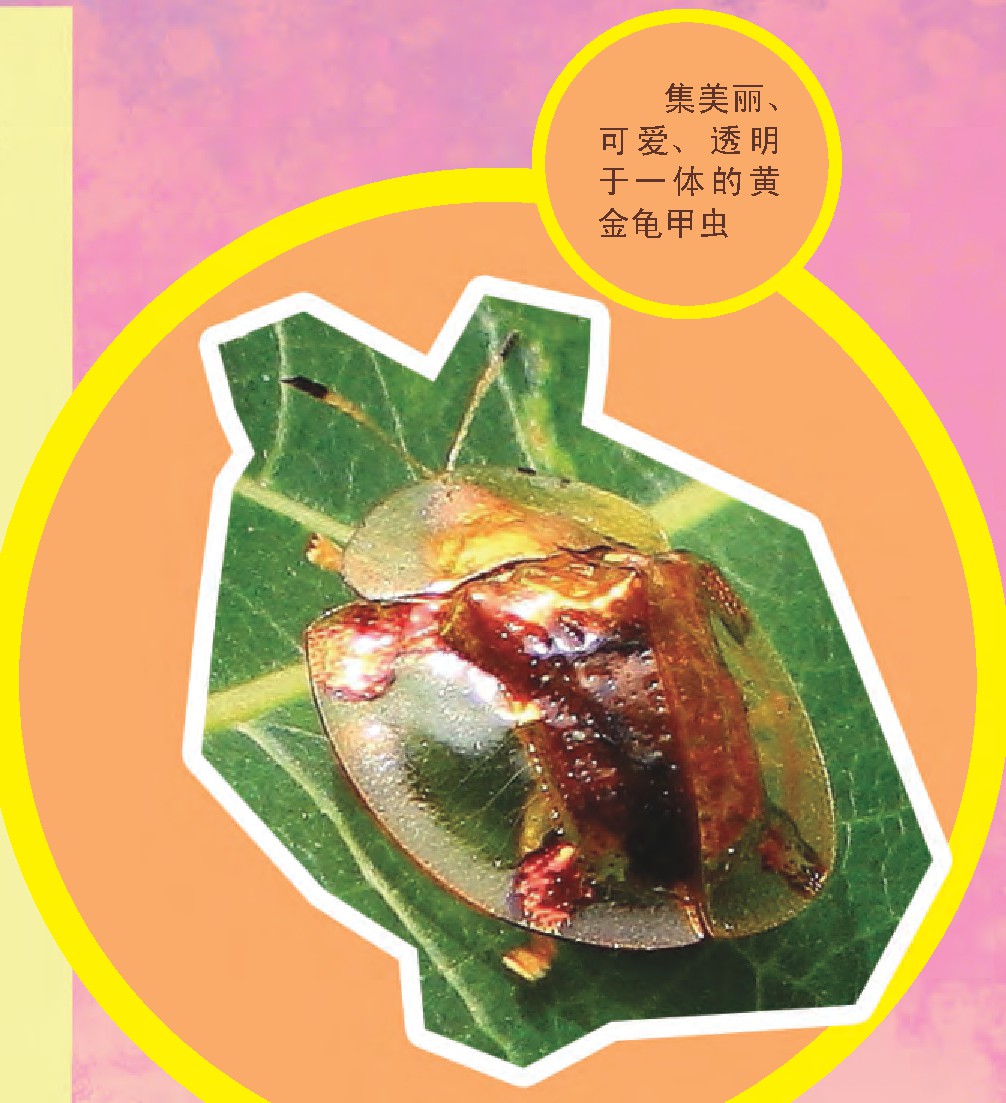 黄金龟甲虫是世界上最小和最迷人的透明生物之一,其长度仅有5毫米~8毫米,外形与瓢虫类似。有趣的是,这种以树叶为食的可爱小虫能显现出金色的光泽,并且可以将颜色变为红铜色。这一变色本领源于它们外角质层下方储藏的水滴,当光线穿过水滴时会产生折射使颜色发生变化。