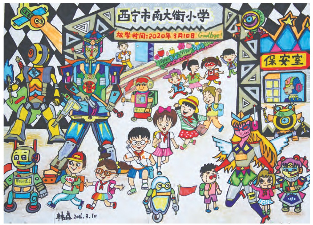 这是未来南大街小学放学时校门口的场景,两名机器人保安全副武装负责保护同学们的安全。每个班都有一个小机器人领队护送同学们排队出校门,两名女机器人是本周的值班机器人,还有监控机器人随时监控学校各处安全情况。有了它们,保安大叔和值班老师就可以轻松多了!