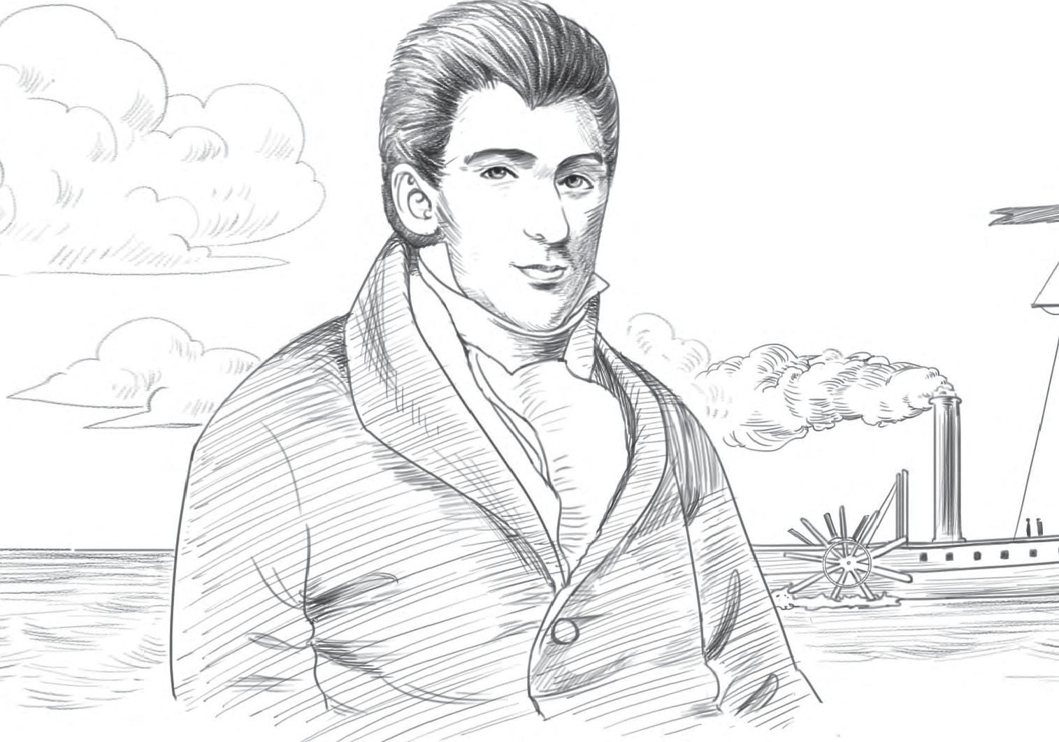 美国人富尔顿在二十多岁时结识了瓦特,从此爱上了蒸汽机,并开始设计制造轮船。当时的美国与欧洲大陆的交通全靠帆船,速度慢,又不够安全。富尔顿深深体会到了这种不便,他决定研发一艘不靠人力、风力驱动也能高速度航行的船只,使美国和欧洲成为近邻。