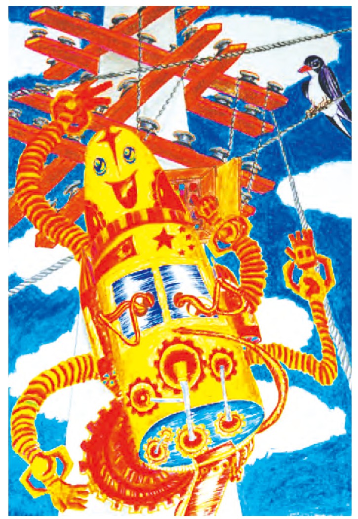 狂风天气,电线很容易被吹断,电力局的叔叔们冒着生命危险登高排险,敬仰的同时我也不禁为其捏一把汗。我想研制一种高空架缆机器人,它拥有数条伸缩自如的长臂和高智能的“大脑”。工作人员只需在地面发出指令,它就能快速完成攀登、检查、维修、故障排除和发送数据等任务。