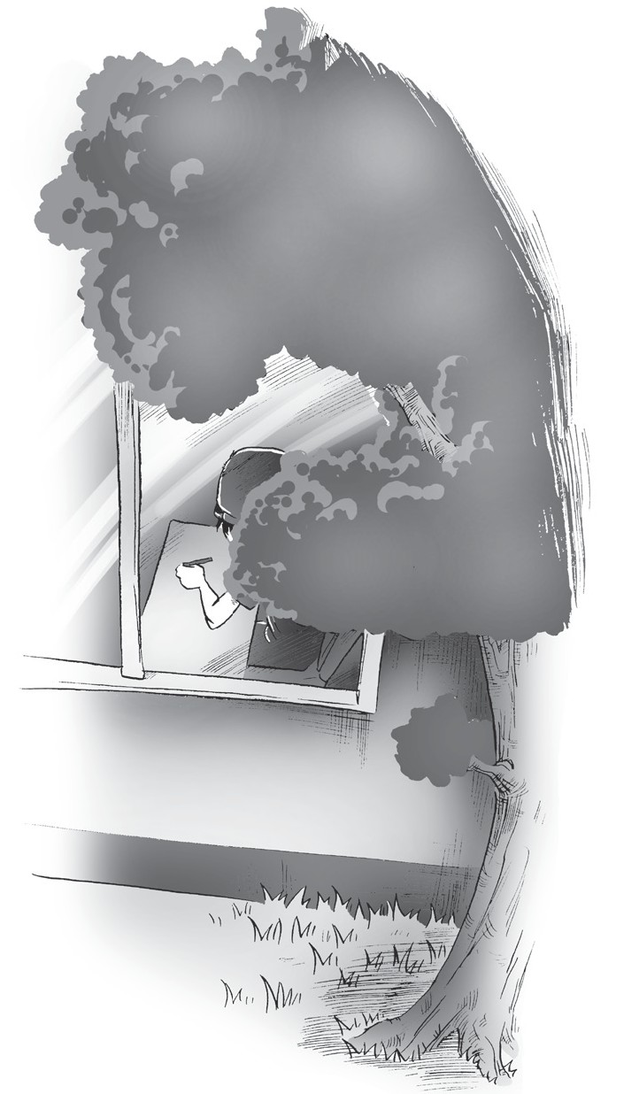王童童并没有发现朵儿在偷看他的卷子,他正咬着笔头冥思苦想。