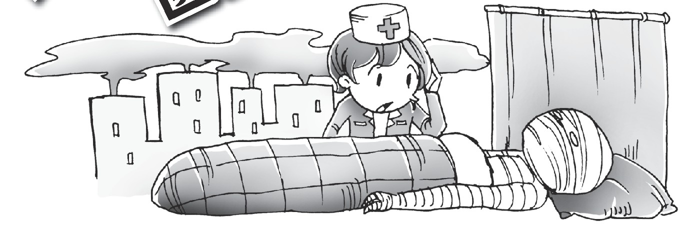 病例最多的,那就是美丽又富有生命力的地球,都快是我医院的贵宾了,每次都是带着重伤来看病,而且每次不是做手术就是要包扎得像个木乃伊。这次地球全身乌烟瘴气,看来“中毒”不浅。,地球呻吟地说:“医生,快救我,我………我快不……不行了。”