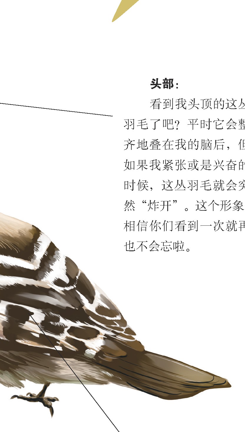 看到我头顶的这丛羽毛了吧?平时它会整齐地叠在我的脑后,但如果我紧张或是兴奋的时候,这丛羽毛就会突然“炸开”。这个形象,相信你们看到一次就再也不会忘啦。