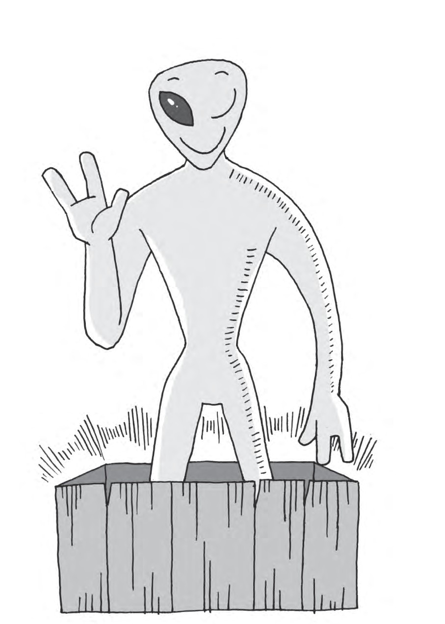 这时,我头上的声波电线忽然竖了起来。我看到考纳斯博士身旁站着一个锥形脑袋,皮肤发着蓝色荧光,有着一对大大眼睛的外星人。他冲我调皮地挤了下眼睛,然后友好地挥了挥只有三根指头的手。