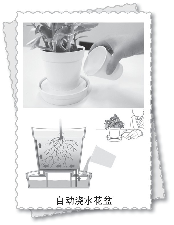 这是一款虹吸花盆,它利用的正是虹吸原理。它能把低处的水吸到高处来。看见花盆底部的圆盘底座了吗?它可以盛放植物一个星期需要喝的水。在花盆的内部装有吸水芯,当土壤变干的时候,它就能把底座里的水分吸上来,输送给植物。瞧,小小的一个改变就能够帮人们解决头疼的问题啦。