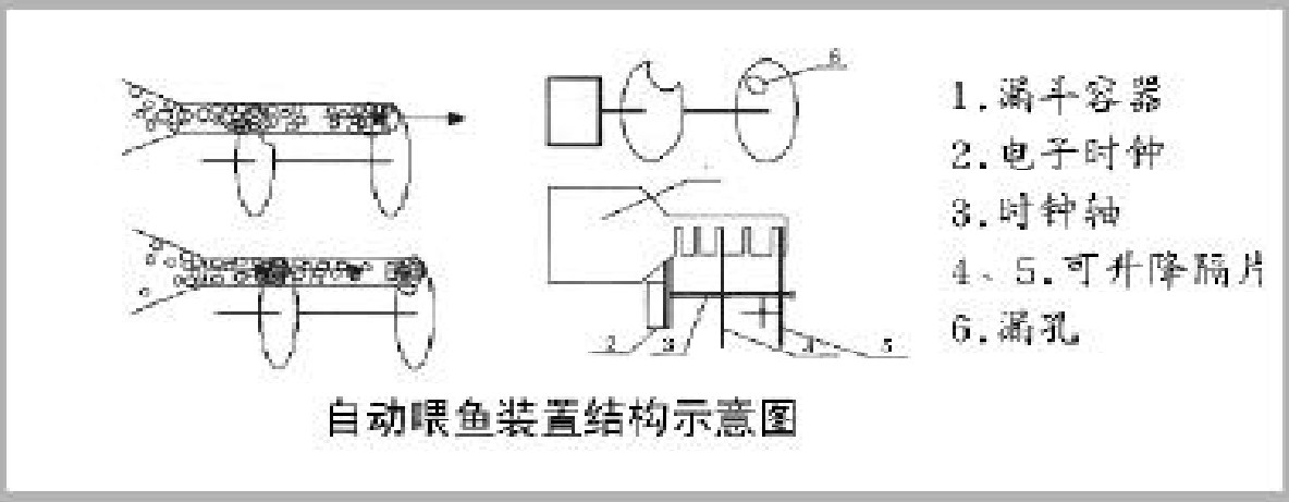 该自动喂鱼装置利用电子时钟和漏定器进行工作,靠时针轴转动,隔片与漏斗形成漏孔或阻隔,使鱼饲料定时漏入鱼缸,从而实现无人情况下的自动喂鱼,并且可以根据鱼的特性来设定喂食时间与喂食量。
