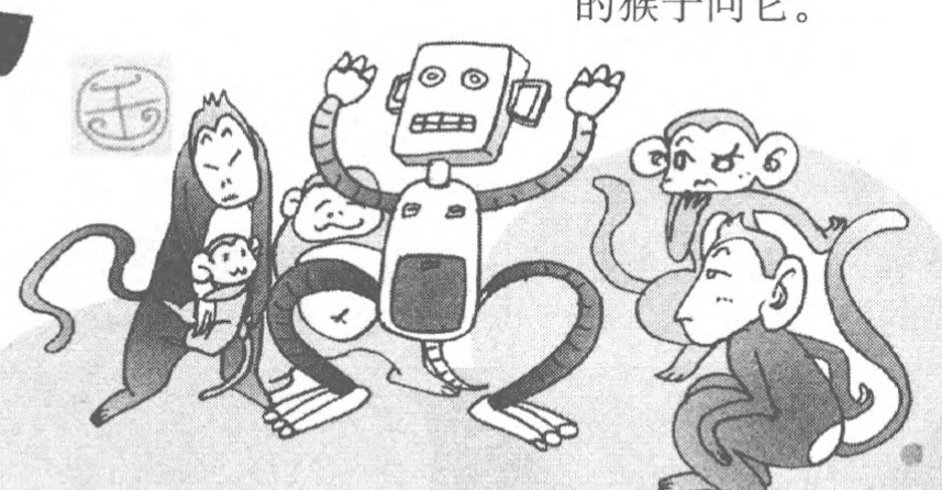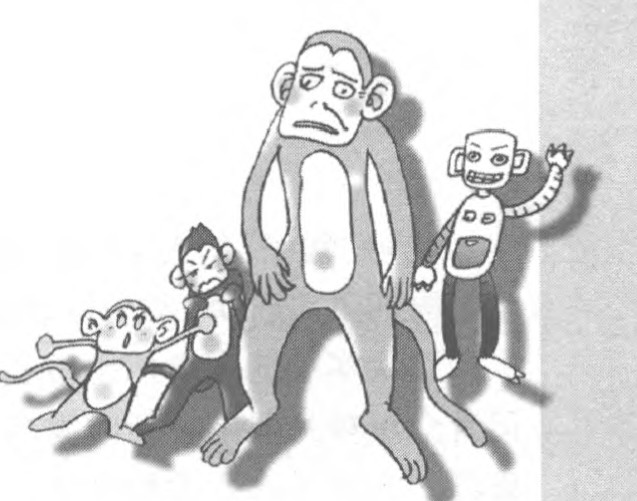 老猴王抓、撕、咬、踢……十八般武艺全部使上。想当年争得猴王宝座时也没这么辛苦。但令它吃惊的是“无毛猴”毫发无损,自己每使出一个新招总能在数秒钟内被它偷学了去,结果这些损招的“战果”全应验在自己身上了。不消几个回合,老猴王毛也秃了,脸也破了,屁股上还火辣辣地痛。再看“无毛猴”,心不跳,气不喘,潇洒自如。