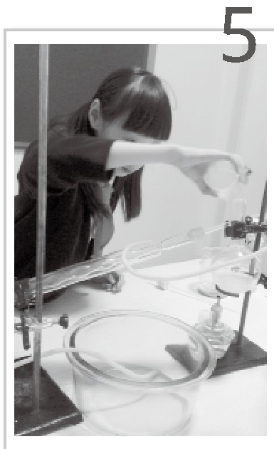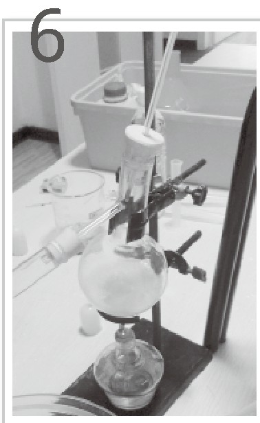 我们先用天平称取了50克苏打饼干。我们把饼干压碎后,首先用研钵进行研磨,然后把饼干末放到一个大烧杯中,再往里面加入石油醚浸泡。石油醚是一种无色透明的液体,能使饼干中的油脂溶解在其中。经过15分钟的浸泡之后,我们将石油醚从大烧杯中倒出,这时的石油醚已经不是原先无色透明的液体了,它的颜色变得黄黄的,比较浑浊,看来饼干中的油脂都已经溶解在里面了。我们小心翼翼地将石油醚和油脂的混合物倒入蒸馏烧瓶中,用铁架台进行固定,再连接上冷凝管和冷水,接着用酒精灯对烧瓶进行加热,并在蒸馏烧瓶里插上温度计,以便观察瓶中温度的变化。
