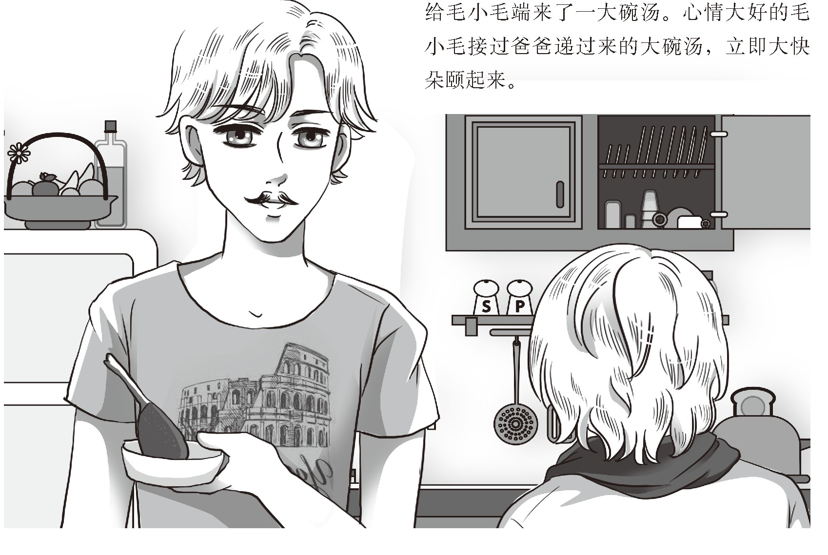 回到家,爸爸看着毛小毛微微上翘的嘴角,什么也没说,只是跟昨天一样,又给毛小毛端来了一大碗汤。心情大好的毛小毛接过爸爸递过来的大碗汤,立即大快朵颐起来。
