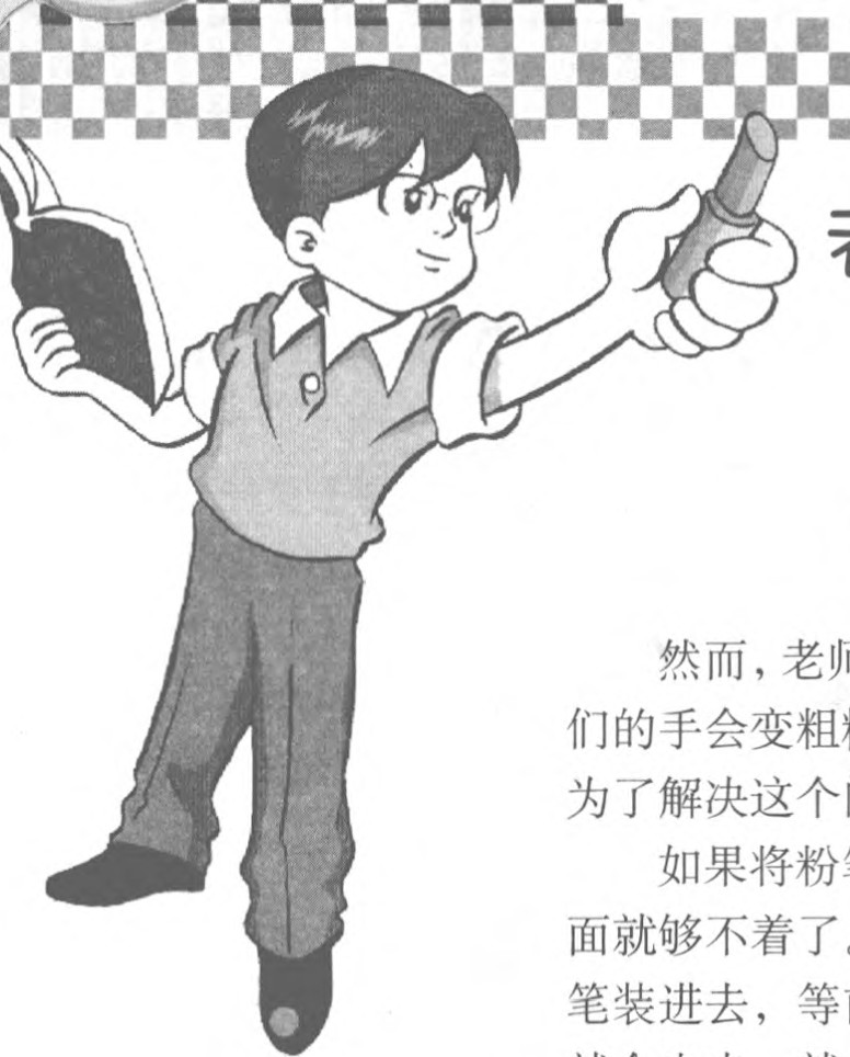 然而,老师却常常在身体上受到很多无形的伤害,比如,他们的手会变粗糙,因为他们用粉笔时,粉笔会腐蚀手上的皮肤。为了解决这个问题,我发明了方便实用的新型粉笔套。